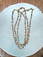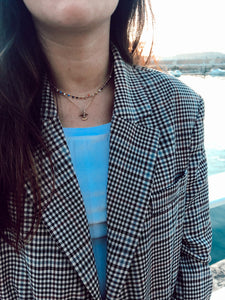Colgante con cadena de latón bañado en oro con cuentas de cristal checo. Cierre de mosquetón y cadena extensora.